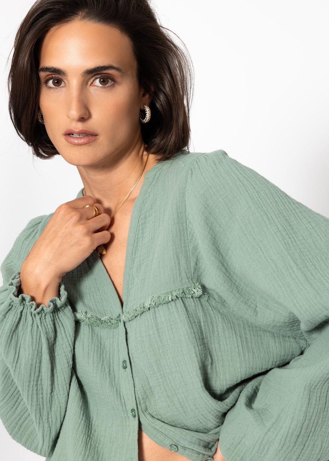 Musselin Bluse mit V-Ausschnitt und Fransen - salbeigrün