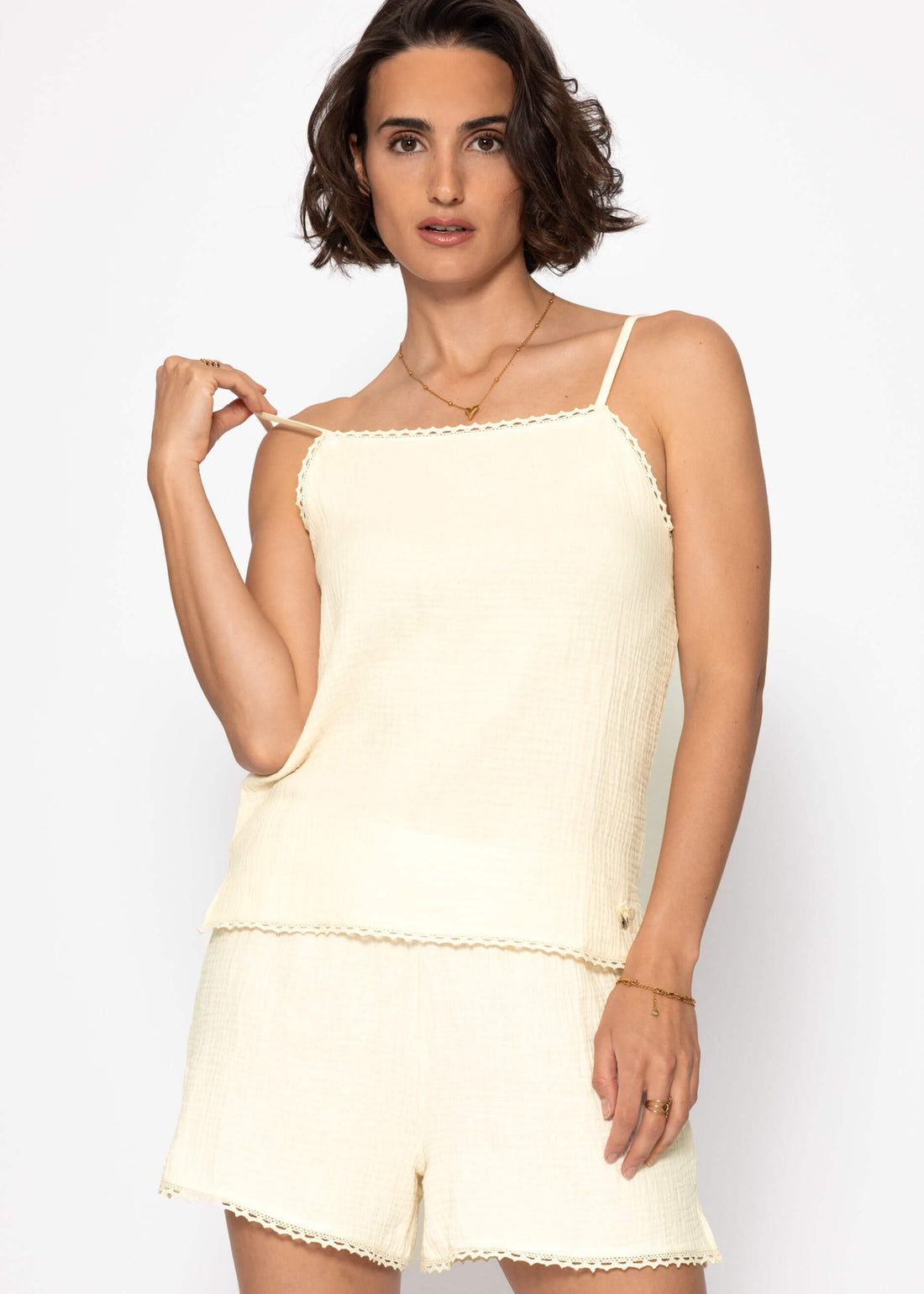 Musselin Pyjamatop mit Spitzenborte in Buttergelb Dieses leichte Musselin Pyjamatop mit Trägern ist ein idealer...