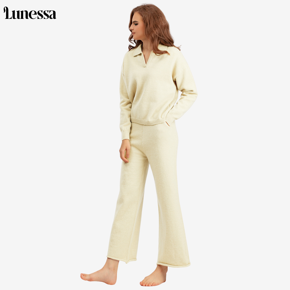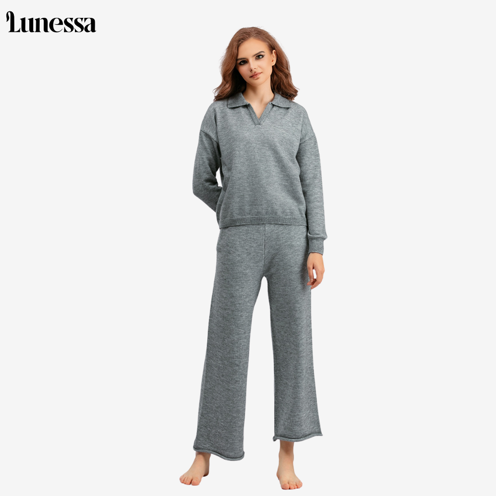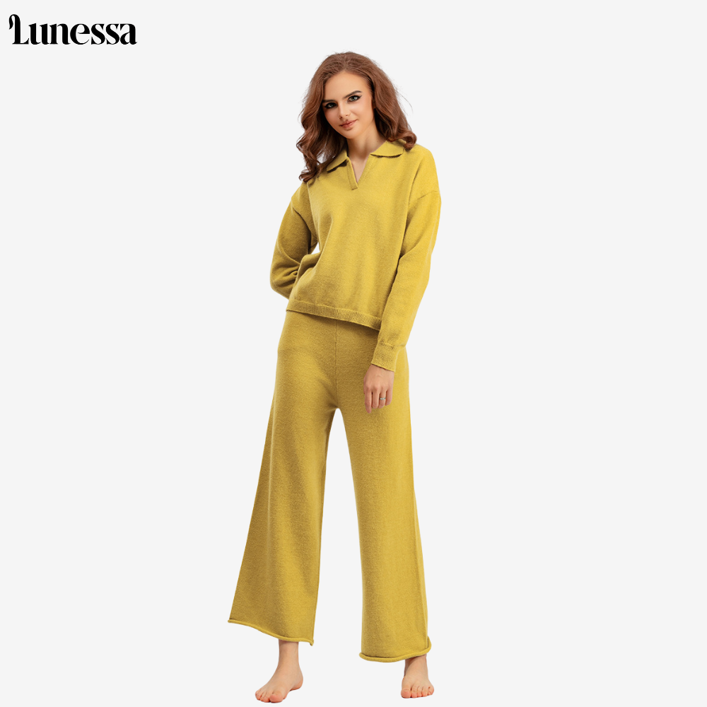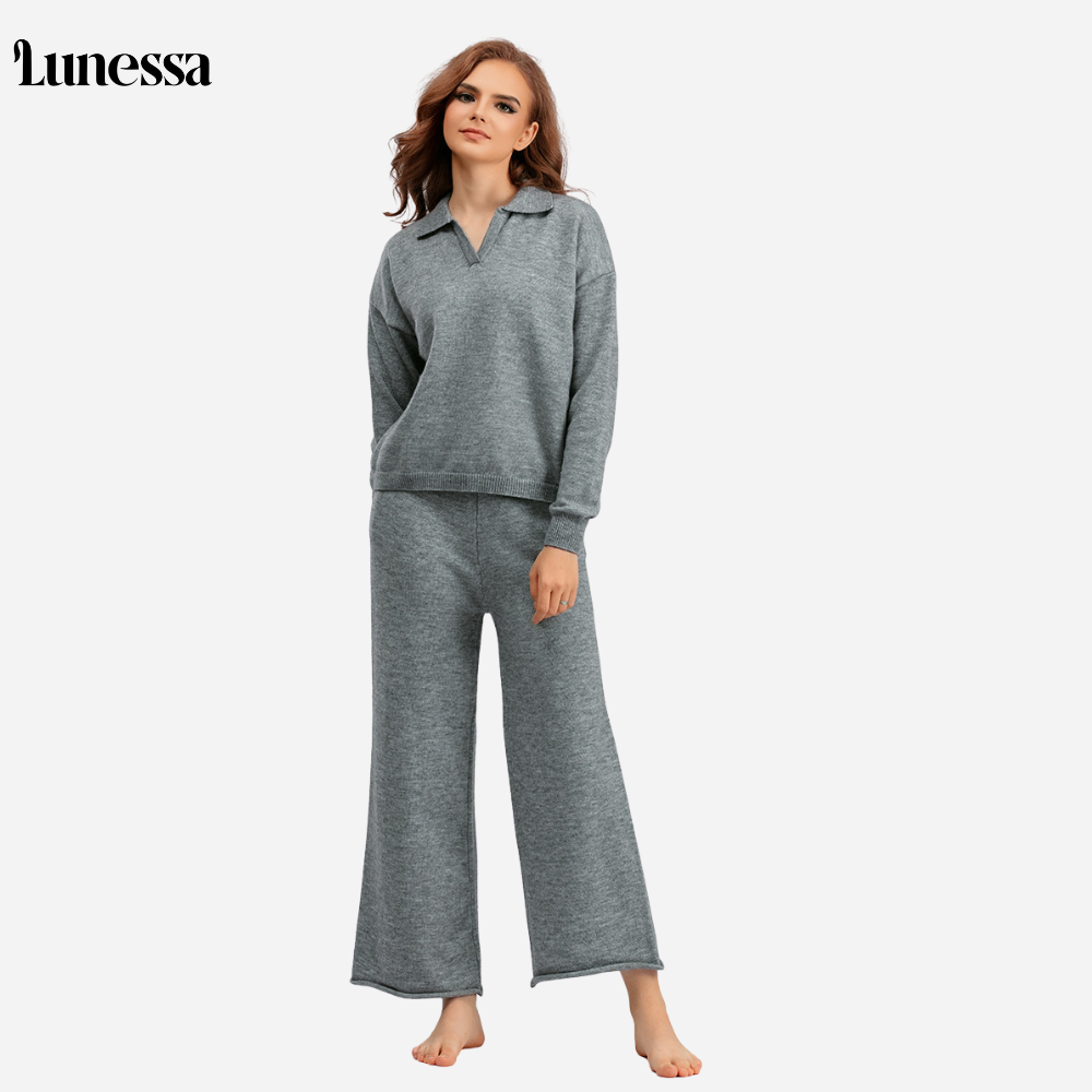 Erleben Sie zeitlose Eleganz und höchsten Komfort mit dem Strickset Eleganz™ – bestehend aus einem lockeren Polokragenpullover und einer weit geschnittenen Hose.