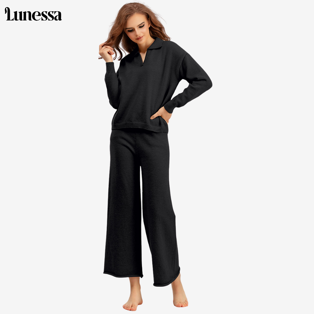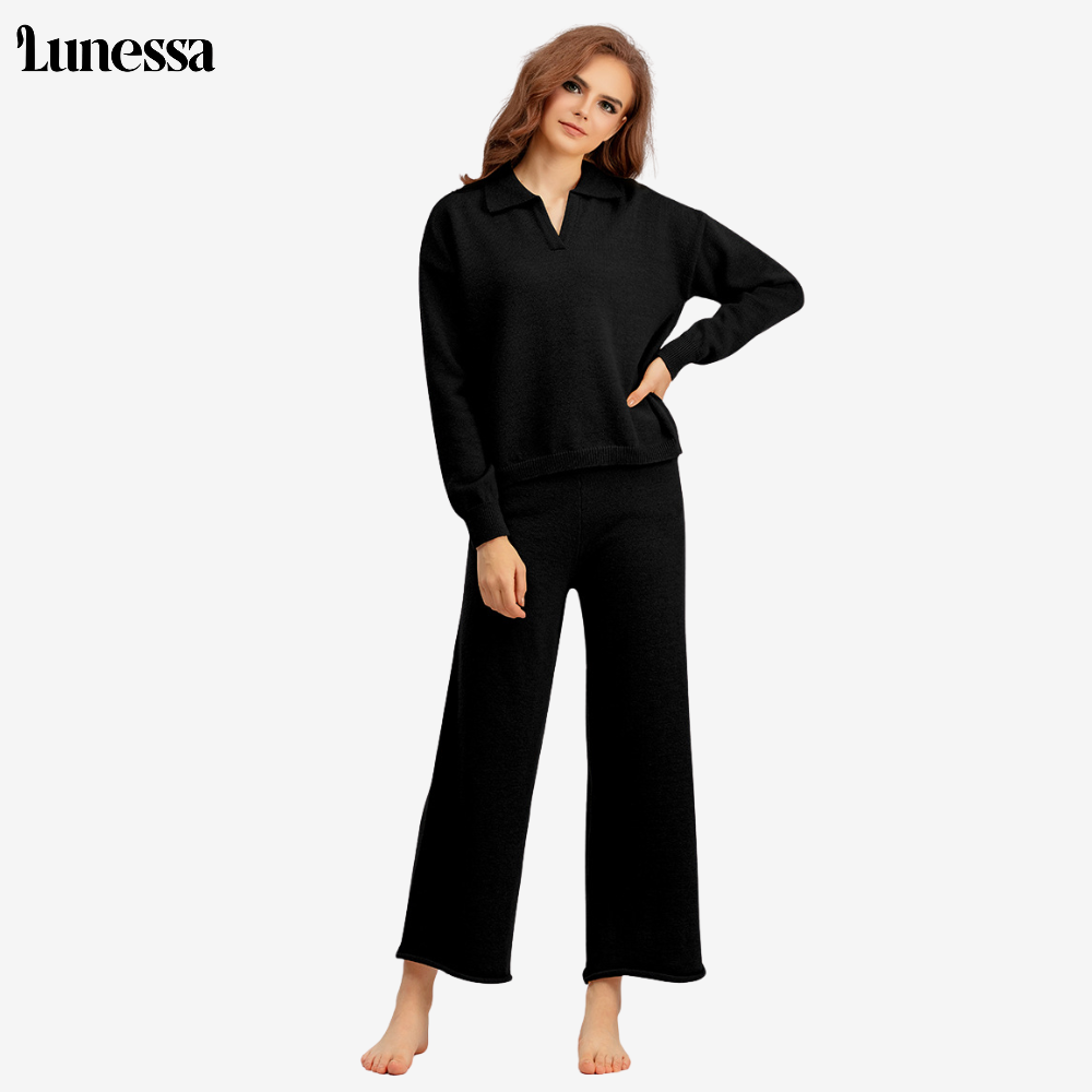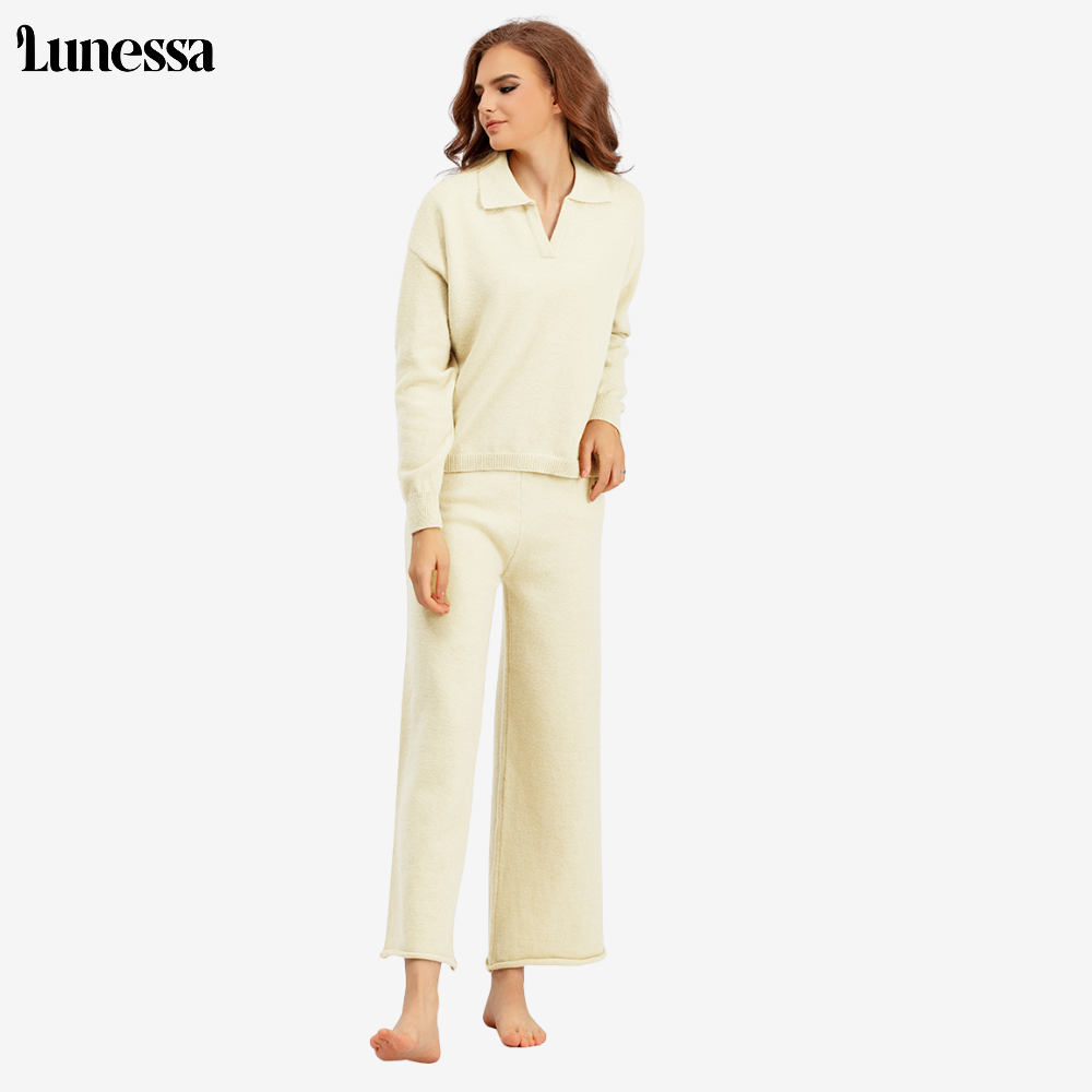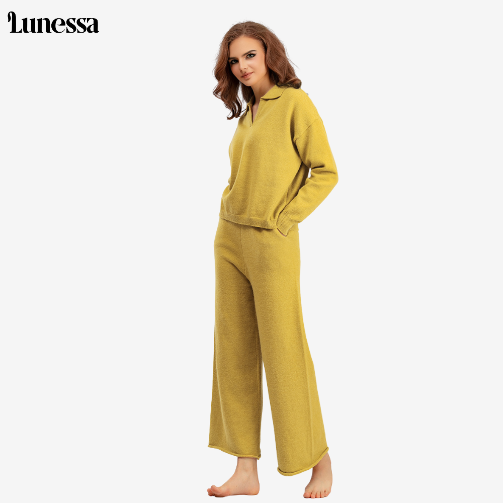 Erleben Sie zeitlose Eleganz und höchsten Komfort mit dem Strickset Eleganz™ – bestehend aus einem lockeren Polokragenpullover und einer weit geschnittenen Hose.