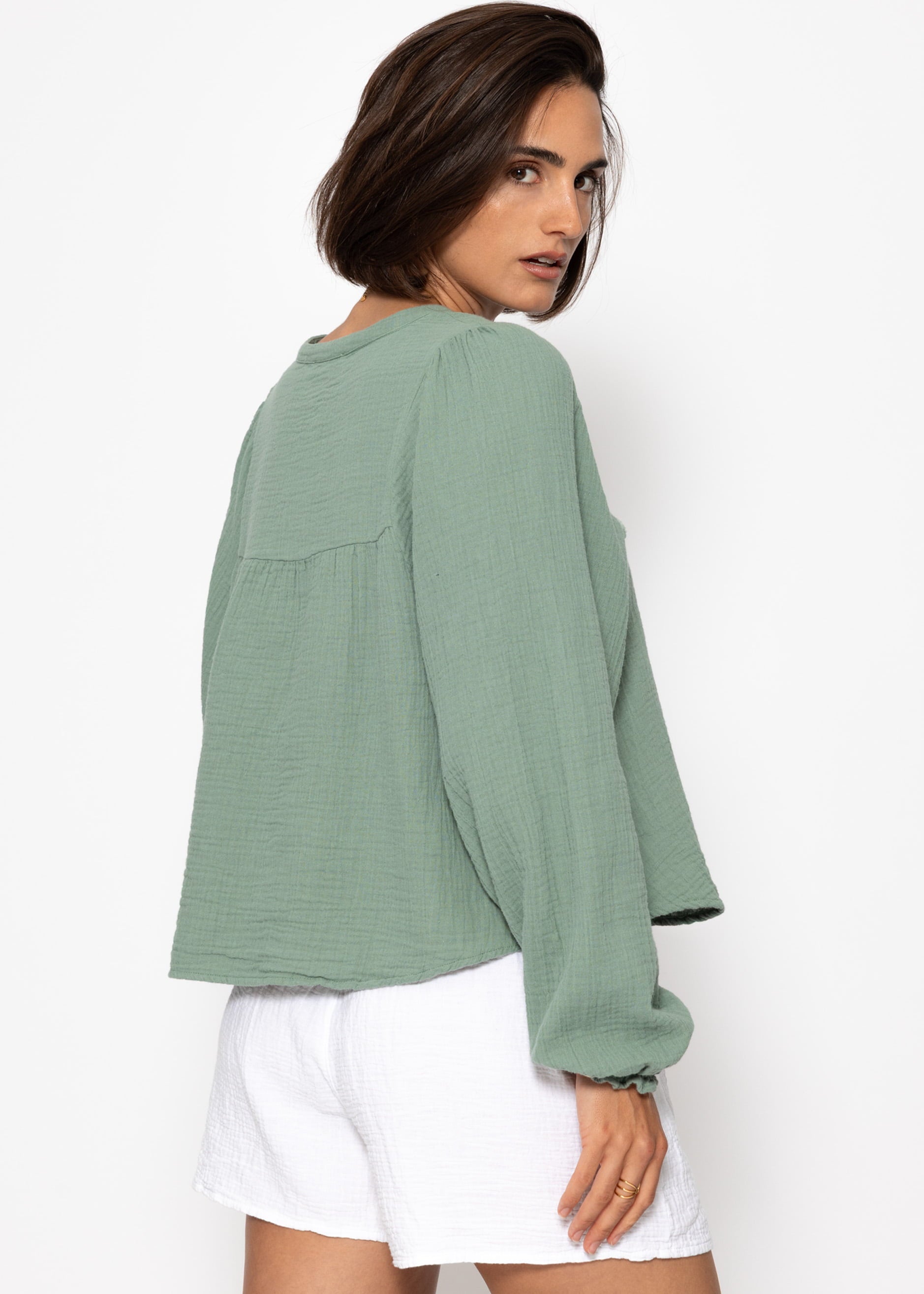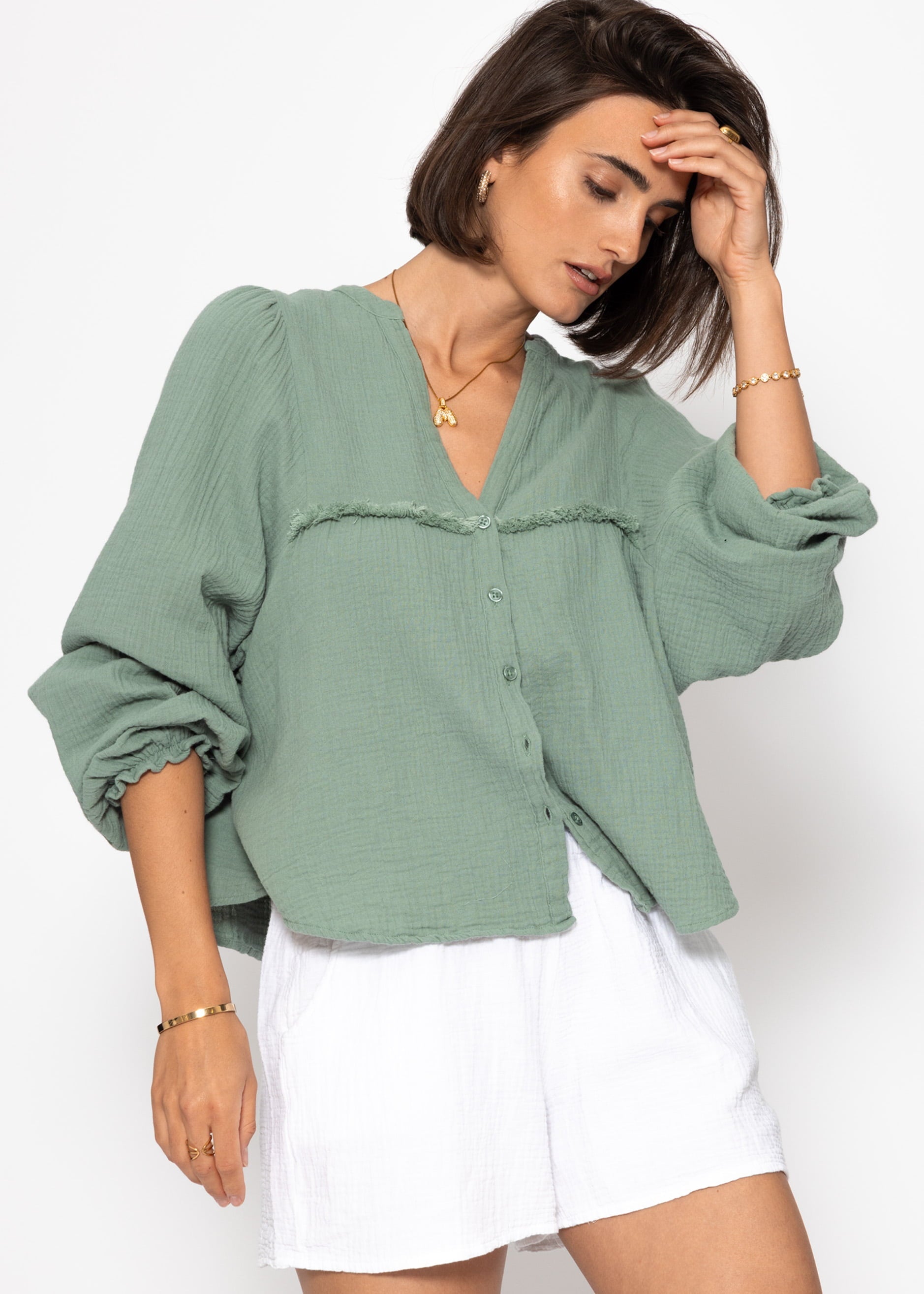 Musselin Bluse mit V-Ausschnitt und Fransen - salbeigrün