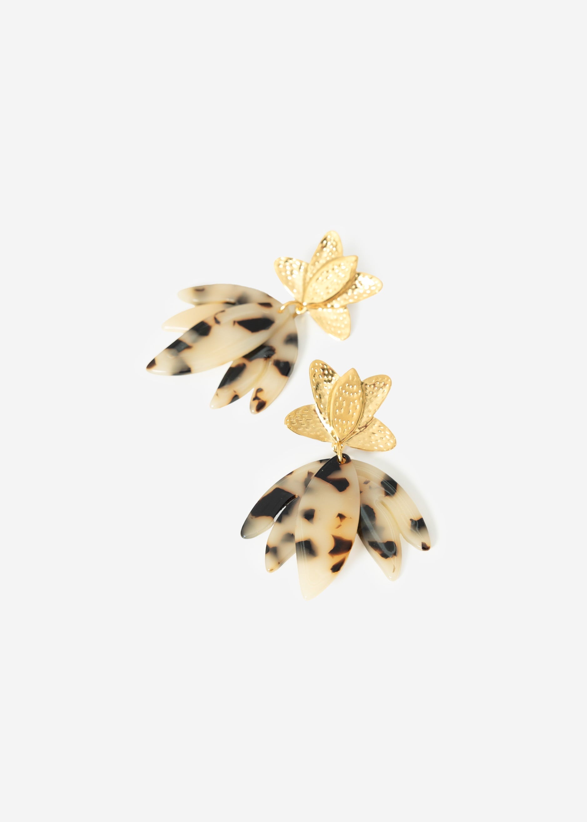 Ein ausdrucksstarkes Design, das Natur und Eleganz vereint: Diese auffälligen Ohrstecker bestechen durch ihr strukturiertes, goldfarbenes Oberteil in Blattform, das stilvoll mit tropfenförmigen Anhängern in moderner Schildpatt-Optik ergänzt wird. Die harmonische Verbindung von Goldglanz und marmorierten Elementen verleiht dem Schmuckstück einen einzigartigen Look mit Retro-Charme. Die Ohrstecker sind leicht und angenehm zu tragen und eignen sich somit ideal für stilbewusste Auftritte – ob im Alltag oder zu besonderen Anlässen.